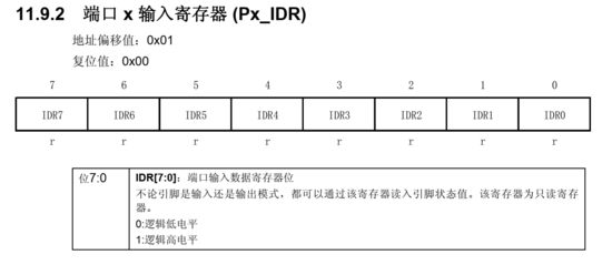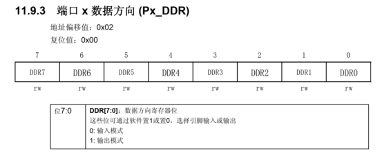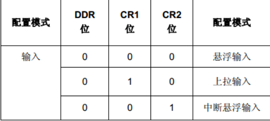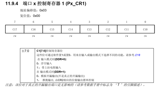 每一个端口都有一个输出数据寄存器 (ODR),一个引脚输入寄存器 (IDR)和一个数据方向寄存器(DDR) ,控制寄存器1(CR1)和控制寄存器2(CR2)用于对输入/输出进行配置。任何一个I/O引脚可以通过对DDR,ODR,CR1和CR2寄存器的相应位进行编程来配置。