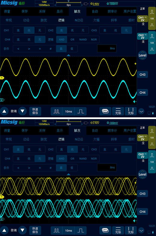 上图中第一个图,当满足 CH1 为低于 2.92V 的触发电平值,且(AND)CH2 高于 -320mV 的触发电平值时就触发,不考虑信号脉宽大小。 从信号可以看出是满足这个条件的,因此信号稳定。