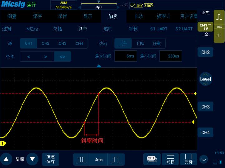 然后我们来看斜率触发。斜率触发是指当信号从一个电平到达另一个电平的斜率时间符合设定的时间条件时,产生触发。如上图信号中,设置为上升边沿的斜率时间满足在 250μs 到 5ms 即触发,且触发起始点在触发电平上限上。此信号的斜率时间大概占据一格,也就是 4ms 左右,满足触发条件,因此波形可以稳定。