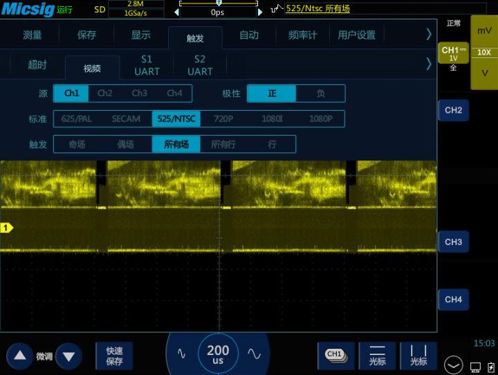视频触发是专门针对视频信号的触发方式,根据视频的制式不同而有所不同,一般有 PAL/625、SECAM、NTSC/525、720P、1080I 和 1080P 等制式。视频触发在不同的电压档位都可以触发,可以根据需要调整合适的电压档位观察波形。