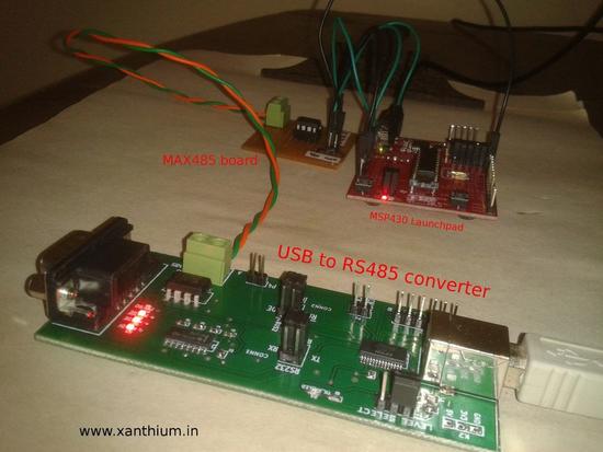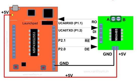 您可以将MAX485芯片焊接到一小块通用PCB上,并将引脚引到凸形bergstrip连接器上,以便轻松地将其与MSP430 Launchpad连接。