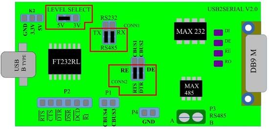 由于USB2SERIAL可以进行USB至RS232转换和USB至RS485转换,请将跳线放在CONN1到RS485上。