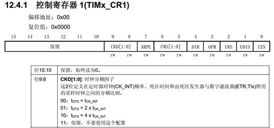 定时器1时钟挂在APB2总线上,时钟为72M 当TIM_ClockDivision = 0时, Tdts = 1/72M = 13.89ns
