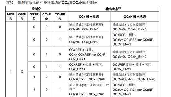 2刹车寄存器的设置:刹车源既可以是刹车输入引脚又可以是一个时钟失败事件。时钟失败事件由复位时钟控制器中的时钟安全系统产生 。通过这段话我理解是刹车是出于安全考虑,才使用。