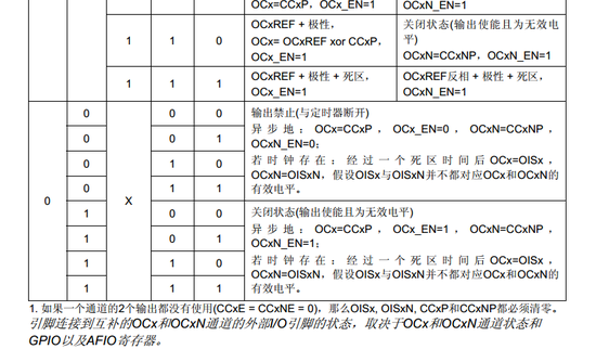 其实这个程序中我将OSSR给1或者0都是一样的,因为从表75我们可以清楚的知道,ossr=0,则当CCXE,CCXNE=0时,两个通道都将输出0,而ossr=1时,CCXE,CCXNE=0时,两个通道将输出我们上面设置的CCXP/CCXNP的值,而这里我的这两个对应位是0,所以效果一样。但是我考虑到万一我需要失能时输出高电平的时候呢,万一我关闭定时器pwm通道的时候我需要通道输出的是高电平呢?所以我设置了此位为1.