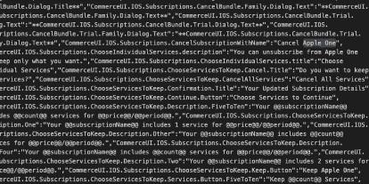 这些字符串包括诸如 “取消 Apple One”,“保留 Apple One”和 “您可以退订 Apple One 并仅保留所需内容”之类的说法。这暗示客户可以选择是否要继续单独订阅 Apple 的服务,或者选择 Apple One 捆绑包选项之一。