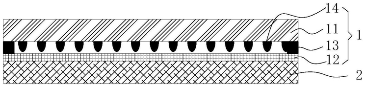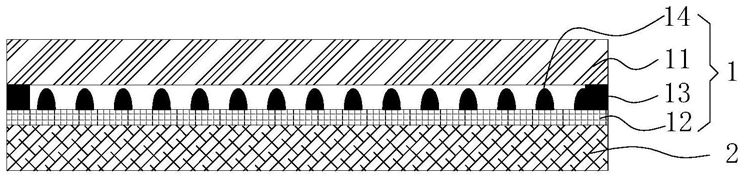 图1是这项发明中提出的一种显示模组示意图,上边的触摸屏1包括盖板11和一侧的触控层12,并在侧面沿触控层12的周部环形设置一圈第一粘胶层13与盖板11粘接,同时盖板11或触控层12上固定有透光的隔离层。另外绝缘点14布满第一粘胶层13内围成的区域,且在整个第一粘胶层13内的区域均匀布置,因此可以实现触控层12的完整隔离,,保证在盖板11对应触控层12的任何位置按压操作均不会出现彩虹纹现象。