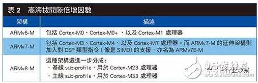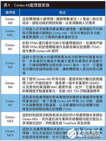 当然在选择处理器时效能并非唯一考量的因素。在许多应用中,低功耗与成本是顾客最关切的标准。因此,Cortex-M处理器家族纳入各种类型的产品来因应不同的需求(表1)。