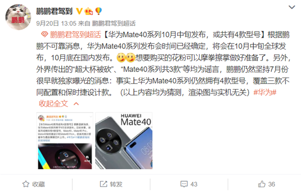 2020年09月21日 | 华为Mate40系列发布时间揭秘:共4款、升级66W快充