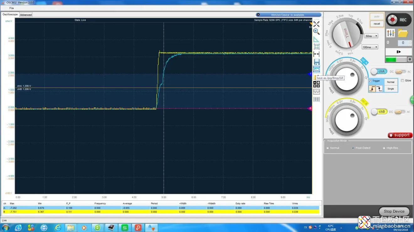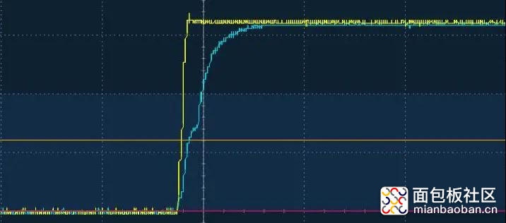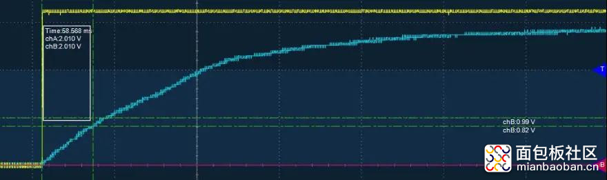但实际过程中采用LOTO的OSCA02示波器的触发功能,捕捉正常工作USB电路板上电时刻复位信号的波形状态;如下图所示(黄色为电压VCC波形,蓝绿色为复 位信号波形):