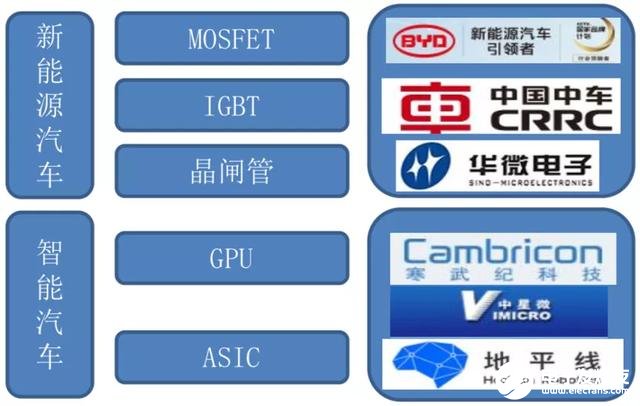 汽车电动化和智能化为汽车半导体市场带来了大量的新增需求,伴随着中国汽车下游市场的快速发展,不断攀升的需求为汽车半导体提供了发展机遇。中国厂商通过收购国外厂商,积极布局汽车半导体新能源、智能汽车领域。目前,中国厂商逐渐布局新能源汽车功率半导体以及智能汽车,其中代表厂商包括比亚迪、中国中车、华微电子、寒武纪科技、地平线以及中星微电子。