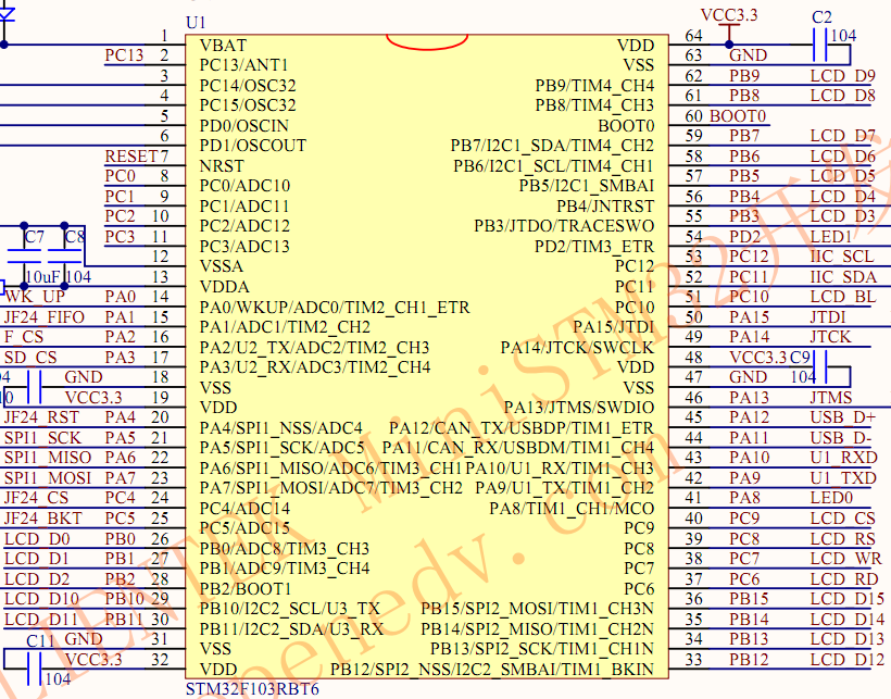 51个IO端口的引脚分别是:PA(0~15)16个,PB(0~15)16个,PC(0~15)16个,PD(0~2)3个,共51个。