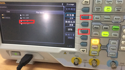 9.将浏览器目录设置为DIR并使用滚轮导航到DS1000Z。示波器上的活动通道应在文件名中显示为ON