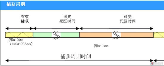 死区时间内示波器不采样数据,是探测不到信号发生的变化的,所以实际上不是所有波形我们都能在屏幕上看到,我们看到的波形其实是被死区时间分隔成一段一段的,因此就有了波形捕获率一说。