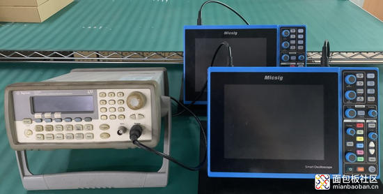 我们用一根BNC转BNC线将信号发生器输入到被测示波器的通道一口,用另一根BNC转BNC线链接被测示波器的Aux out接口和测量示波器的通道一口。