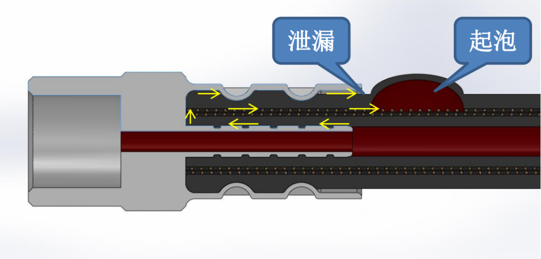 ①软管总成在使用过程承受压力和脉冲压力下从接头衬芯外壁与胶管内壁之间渗漏出来,由于编织层与外层胶粘合较好或衬套内壁与胶管外层密封性也较好,在胶管顶端产生积液腔,渗漏出液体并累 积产生压力,在使用中不断脉冲压力作用下软管一点点外移最终产生脱头。