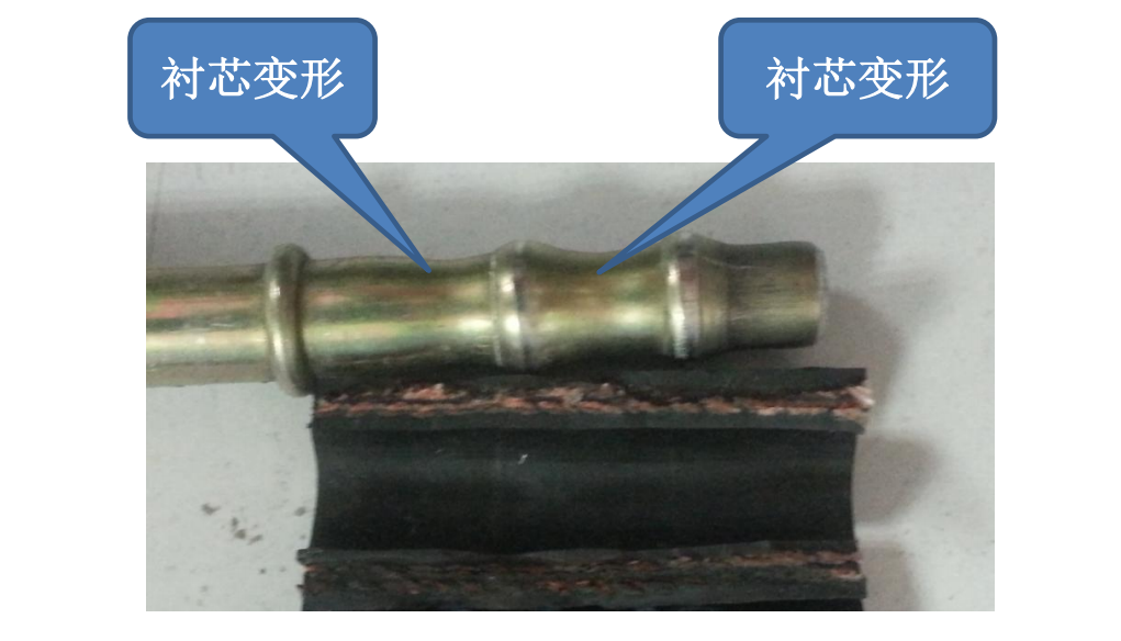⑧ 衬芯材料不符合要求或衬芯壁厚较薄、强度不够,铆压时将衬芯压变形,使接头衬芯外壁与胶管内壁密封性降低产生鼓泡或泄漏。