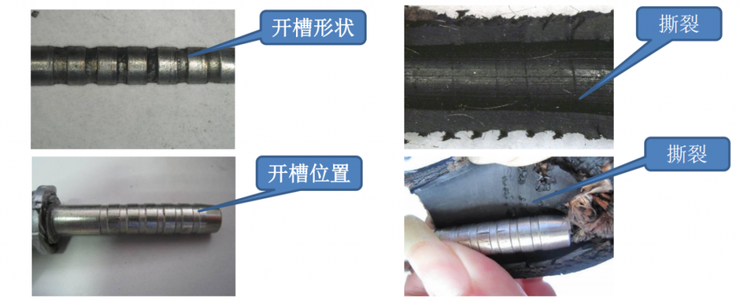 ④ 衬芯开槽形状和位置不合理,铆合后损伤胶管内壁,在使用中的反复脉冲压力作用下内层胶被撕 裂,从而产生爆管。