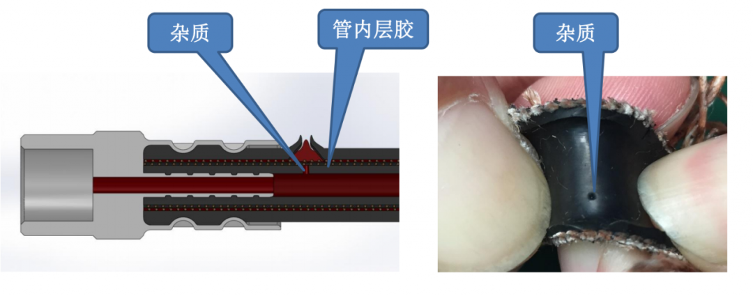 ⑥ 胶管内层胶偏薄或有杂质,在使用中的反复脉冲压力作用下,从而产生爆管管。