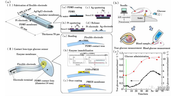 图4 (a)隐形眼镜生物传感器的制备方法:(Ⅰ)在PDMS膜上形成柔性电极,(Ⅱ)将柔性电极粘合到隐形眼镜表面;(b)用隐形眼镜生物传感器和商业血糖监测试剂盒测量泪液中的葡萄糖;(c)泪液和血液中的葡萄糖水平随时间的变化