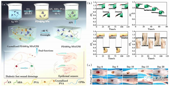 图3 (a)PDA@AgNPs/CPHs水凝胶的制备过程及其作为表皮传感器和糖尿病足敷料的应用示意图;(b)PDA@AgNPs/CPHs应变传感器,用于检测人体的运动;(c)在 20 d中分别用PBS和PDA@AgNPs/CPHs 处理鼠糖尿病足伤口照片,显示了PDA@AgNPs/CPHs糖尿病足伤口愈合的作用