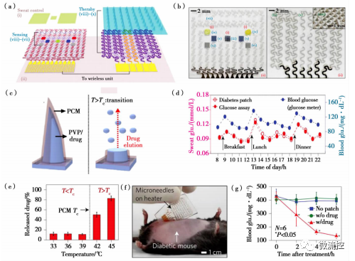 图2 (a)微针贴片集成模块示意图,由控汗(i,ii)、传感(iii-vii)和治疗(viii-x)组件组成;(b)微针贴片传感阵列(左)和治疗阵列(右)光学相机图像:(i)汗液吸收层;(ii)防水膜;(iii)湿度传感器;(iv)葡萄糖传感器;(v)pH传感器;(vi)Ag/AgCl电极;(vii)微震传感器;(viii)含药物的微针;(ix)加热器;(x)温度传感器;(c)生物可吸收微针的结构示意图;(d)一日检测人体汗液和血液中的葡萄糖浓度曲线图;(e)不同温度下微针进行药物释放;(f)将微针贴在老鼠腹部进行治疗;(g)治疗组(含药物)和对照组(无贴剂和无药物)的小鼠体内葡萄糖含量