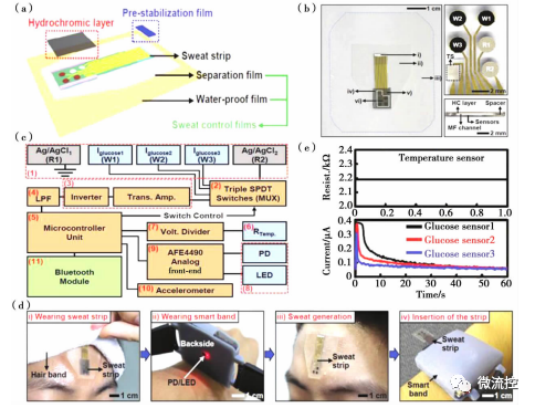 图5 5(a)一次性汗液分析条的结构示意图;(b)一次性汗液分析条的光学相机图像(左),葡萄糖传感器放大图(右上方)以及汗液条的侧视图(右下方);(c)内部电极组件的集成连接示意图;(d)光学相机图像的测量步骤:ⅰ,将汗液条贴在额头皮肤上;ⅱ,佩戴智能手环;ⅲ,汗液产生;ⅳ,将汗液条插入智能手环测量汗液葡萄糖;(e)温度传感器的电阻响应(顶部)和葡萄糖传感器的电流响应(底部)