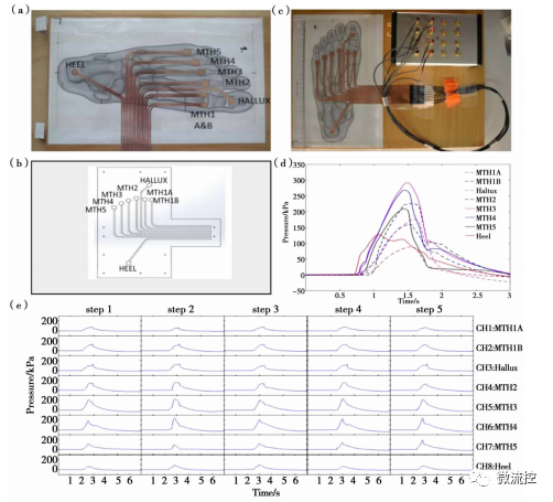 图6 6(a)鞋内传感器由八个测量点组成;(b)金属膜板;(c)PVDF鞋内传感器的测量装置;(d)八个独立传感器测量实验结果;(e)用八个独立的传感器进行五次测量得到的实验结果