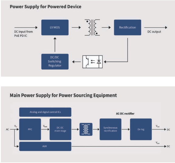 图 3:PD 利用原本只能用于 LED 照明等特定应用的通用隔离型 DC/DC 转换器解决方案(上图)进行供电。PSE 需要高效的 PFC 和采用隔离型拓扑结构的低损耗开关(下图)。