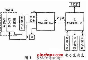 本系统为基于双MSP430F169单片机多路电阻测量系统。使用2个MSP430F169单片机协调工作,从机MSP430F169利用自带的8路A/D通道实现多路数据的测量、采集并对所采集的数据进行计算与分析,主机MSP430F169负责储存、控制、显示以及和上位机的通信。利用MSP430F169单片机的固有的USART模块,采用I2C总线进行串行通信,实现处理器之间的命令控制和数据交换。电阻测量电路采用恒流源测量电阻,将待测电阻接入恒流源电路,对电阻两端施加恒定电流,在电阻两端形成稳定的压降。由于电阻两端输出的电压值比较小,需要通过放大电路对电压进行放大。通过单片机自带的A/D接口对待测电压进行采集,由欧姆定律算出相应的阻值,再除以放大倍数,即可得到待测小电阻的阻值。系统框图如图1所示。