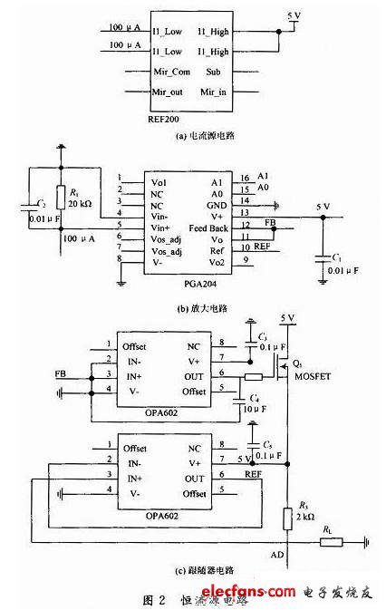系统硬件电路主要由从单片机恒流源电路和主单片机电路组成,主单片机电路部分主要实现控制、显示、存储、与上位机通信等功能,硬件电路比较简单限于篇幅不再累述。从单片机恒流源电路主要由电流源电路、放大器电路和跟随器电路组成。以下着重对系统的从单片机恒流源电路的设计进行介绍。