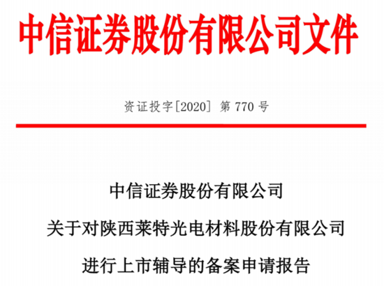 9月23日,据陕西证监局披露,2020年9月,中信证券与陕西莱特光电材料股份有限公司(以下简称“莱特光电”)签署了上市辅导协议,中信证券接受莱特光电的委托,同意作为其首次公开发行股票并A股上市的辅导机构。