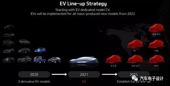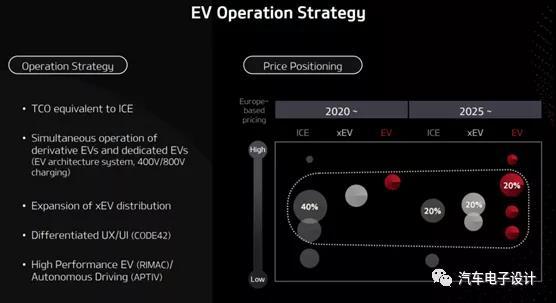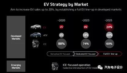 图 1 起亚的 EV 战略决策 现在根据其总体的公司规划,大致可以分为以下的走法: 1) 纯电动汽车,起亚规划是从 2020 年的 4%,到 2023 年的 9%,到 2025 年 20%(50 万台);这包含 11 台电动汽车的阵容,要占到全球 BEV 市占率的 6.6%(预计到时候全球是 750 万 BEV 的销售) 2) xEV 包含 HEV 和 PHEV,规划是从 2020 年的 8%,2023 年的 18%到 2025 年的 20%,这样电驱动的车辆总共 40%为 100 万台 3) 而面向发展中国家的市场,起亚还是认为会围绕发动机来做 图 2 发展 BEV 的战略目标 起亚的纯电动汽车矩阵,是从 Soul Bev 和 Niro BEV 开始的,还有一款纯电动小货车;加上 2021 年基于 EMP 平台开发的 CV 概念车,还包括超紧凑型轿车、大型轿车、紧凑型 SUV、 中型 SUV 和 MPV。 图 3 起亚的纯电动汽车矩阵 在起亚之前的规划里面,其实是围绕兼容性的 HEV 和 PHEV 进行的,基本上把能做 HEV 和 PHEV 的都做了,由于形势的变化,这次等于在 2025 年前多加入了一堆 BEV 的车型。 图 4 起亚之前的规划矩阵 从具体的纯电动汽车运行策略来看,主要包括: 同时发展兼容性 BEV 和专用纯电动汽车平台,架构上分 400V 和 800V 架构同时演进 在发展 BEV 的同时,扩展对应的 HEV 和 PHEV 的矩阵, 高端跑车通过和 RIMAC 合作,智能驾驶方面依靠和 APTIV 的合资公司 区分来看,采用了差异化的系统,起亚在纯电动销售模式的创新,也会通过纯电动汽车全生命周期的综合管理,包括定制的订阅模式和电池租赁方案,这些其实国内已经开始使用了 图 5 起亚的电动汽车运行策略 这个专用平台上构建出来的起亚首台车,WLTP 工况可能是 500 公里,充电时间定义为 20 分钟,从目前来看还是在现有的 Niro 的 64kwh 的基础上加了电池,最大的差异化还是做了快充方面的优化。 图 6 起亚的下一代纯电动平台 这是目前起亚的电气化矩阵,从 48V 系统的 0.44kwh,到 HEV 的 1.46kwh 再到 PHEV 的 8.9-11.26kwh;BEV 实从 40-64kwh 两种配置。由于欧洲对 PHEV 的界定需求,起亚在中型 SUV 索兰托 PHEV 上了 13.8kwh 的电池系统。 图 7 起亚的电气化矩阵 目前 Seltos EV 和 K3 BEV 都是和 Niro BEV 相似的电池系统,欧洲上的新车是索兰托 PHEV,今年在欧洲冒出来好几款 SUV 的 PHEV,我们后面来总结下。 图 8 2020 年起亚的新车规划表 小结:韩国汽车工业,其实在它的主要市场过得挺分裂的,好在韩国本身也在同时支持 BEV 和 FCV,现代起亚是以此为依托在欧洲导入 BEV 和 PHEV,在发达国家市场上努力做 HEV,而且起亚的 48V 系统也很有意思。