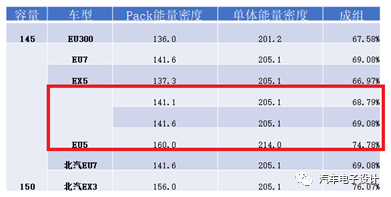 从技术细节来看,以主力的 EU5 这款车型为例,通过 CTP 的设计,也包括部分电芯的更新,数据来看电芯的能量密度同样在 150Ah(1C)的规格从 205Wh/kg 升级到 214Wh/kg,而 Pack 的能量密度是从 141Wh/kg 提升到了 160Wh/kg。