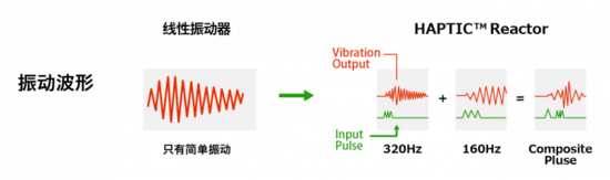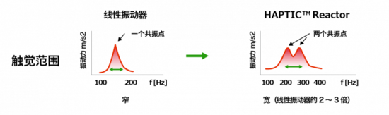 我公司的“HAPTIC™ Reactor Hybrid Tough Type”,是在独有结构的线圈内通电,在元器件内部生成振动的电磁式振动执行器。通过这种振动模式来打造出各种触觉感受。LRA(线性振动器)和 ERM(偏心马达)等其他方式的振动方向只有单轴简单振动,而本产品拥有双轴的振动自由度,对复杂的振动波形也能真实再现触觉(图 1)。此外,该产品有 320Hz/160Hz 两个共振点,因此频率范围是 LRA 的 2~3 倍,可表现出丰富的触觉(图 2)。并且与普通 ERM 的振动响应速度 10ms 以上相比,该产品的反应速度只有不到 1ms,因此能实现无延迟的流畅反馈。除此以外,它的尺寸很小,只有 10×22.6×9,且电压设定无需升压回路,具有良好的贴装性,有助于提高安装设计自由度。