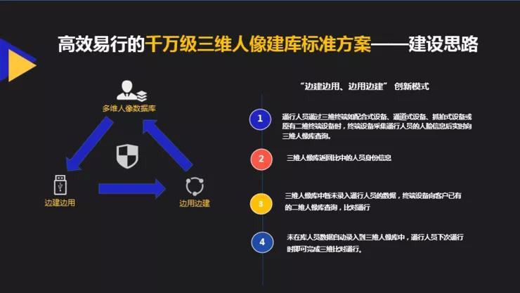 它主要是通过对身份证信息中的照片和现场拍的图像做人脸识别比对,准确率可以保证,在这样的前提下,我们把 2D 摄像头换成 3D 摄像头,就可以同时采集到 3D 信息。虽然采集的 3D 信息质量不一定很高,但是只要有足够的应用频次,就可以帮助用户实现一个高质量的 3D 数据库建设,而不需要特地去建一个 3D 人脸数据库。这是我们的建设流程。