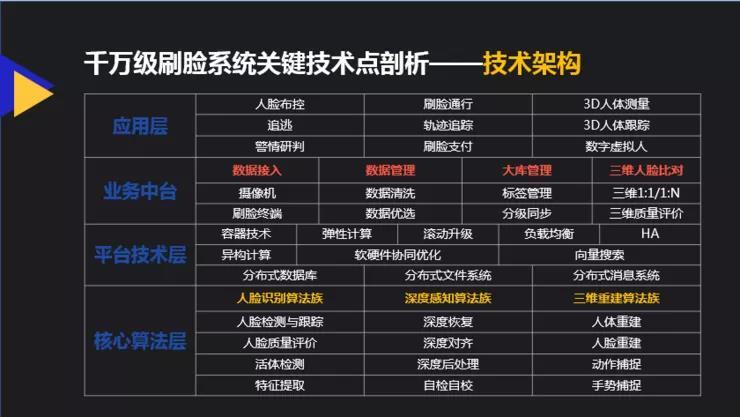 在技术架构方面,自下而上分为核心算法层、平台技术层、业务中台层和应用层。在算法层,围绕 3D 视觉技术的深度感知算法族、三维重建算法族和人脸识别算法族至关重要。在业务中台层,如何通过数据接入、数据管理、大库管理和人脸比对算法等各技术模块的不断优化,从而提升应用效率至关重要。