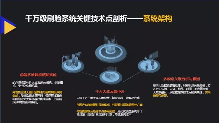 在系统架构方面,分为三个层次,由前端多维智能感知系统、千万大库云端中台和基于大数据的多模态关联分析与预测后台组成。