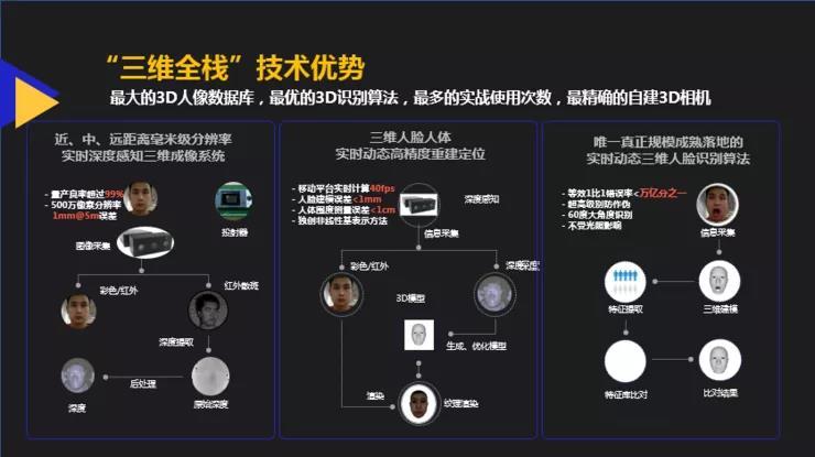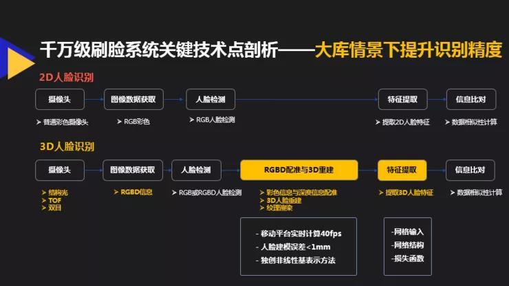 而 3D 的流程比较复杂,前端是符合标准的 3D 摄像头,在获取了图像数据并进行了人脸检测之后,还需要进行 RGBD 数据配准与 3D 信息重建,把人脸信息进行完整的三维恢复。同时,在恢复的三维人脸模型上提取三维人脸特征,最后进行比对。