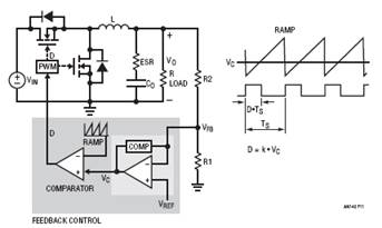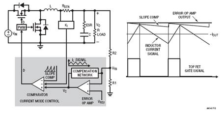 输出电压可由闭环系统调节,如图11所示。例如,当输出电压增加时,反馈电压VFB增加,而负反馈误差放大器的输出减少。因此,占空比减小。输出电压被拉回,使VFB = VREF。误差运算放大器的补偿网络可能是I型、II型或III型反馈放大器网络[3] [ 4]。只有一个控制环路来调节输出。这种方案称为电压模式控制。ADI LTC3775和LTC3861是典型的电压模式降压控制器。