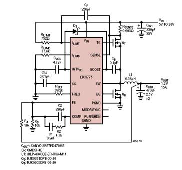图12显示使用LTC3775电压模式降压控制器的5V至26V输入、1.2V/15A输出同步降压电源。由于LTC3775具有先进的PWM调制架构和极低(30ns)的最短导通时间,因此该电源适合将高电压汽车或工业电源转换为当今微处理器和可编程逻辑芯片所需的1.2V低电压的应用。高功率应用需要具有均流功能的多相降压转换器。使用电压模式控制,需要额外的均流环路来平衡并联降压通道中的电流。用于电压模式控制的典型均流法是主从法。LTC3861就是这样一款PolyPhase®电压模式控制器。其±1.25mV的超低电流检测失调电压使得并联相位之间的均流非常精确,从而平衡热应力。[10]