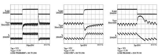 图15.LTC3833电源在快速负载阶跃瞬态期间提供快速响应