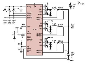 图17.使用LTC3829的3相、单路VO高电流降压转换器