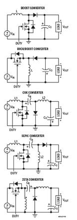 本应用笔记以降压转换器为例简单说明SMPS的设计考虑因素。但是,至少还有五种其他的基本非隔离式转换器拓扑(升压、降压-升压、Cuk、SEPIC和Zeta转换器)和至少五种基本隔离式转换器拓扑(反激、正向、推挽、半桥和全桥),本应用笔记未对这些拓扑进行说明。每种拓扑都有独特的特性,适用于特定应用。图19显示其他非隔离式SMPS拓扑的简化原理图。