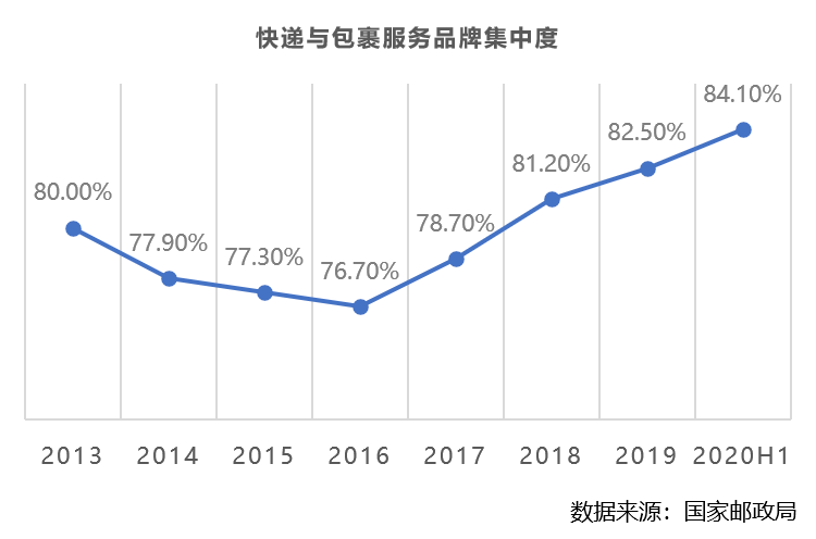 而这也在促使物流行业市场格局进一步集中化。自2017年以来,物流市场增速大幅放缓,行业发展进入整合期,中小企业逐渐被淘汰,物流行业市场集中度不断提高。智慧物流大势下,这种大者恒大强者恒强的局面正在加剧。据国家邮政局数据,今年2月快递与包裹服务品牌集中度指数CR8一度高达86.4%,随后虽然开始回落,但到6月这一指数仍然有84.1%,较去年底高1.6个百分比,物流品牌集中速度明显快于2019年。