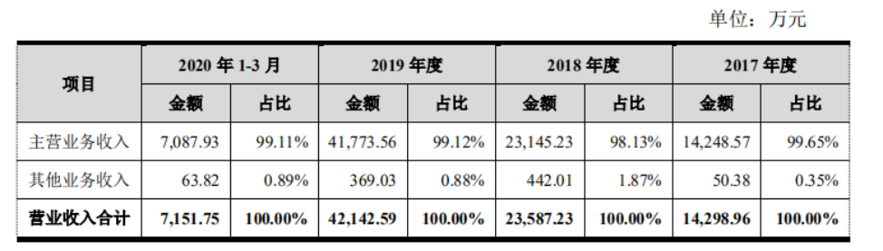 据招股书披露,2017年度、2018年度、2019年度和2020年1-3月,该公司前五大客户收入占当期营业收入的比重分别为36.97%、41.18%、57.66%和45.48%,客户集中度较高。