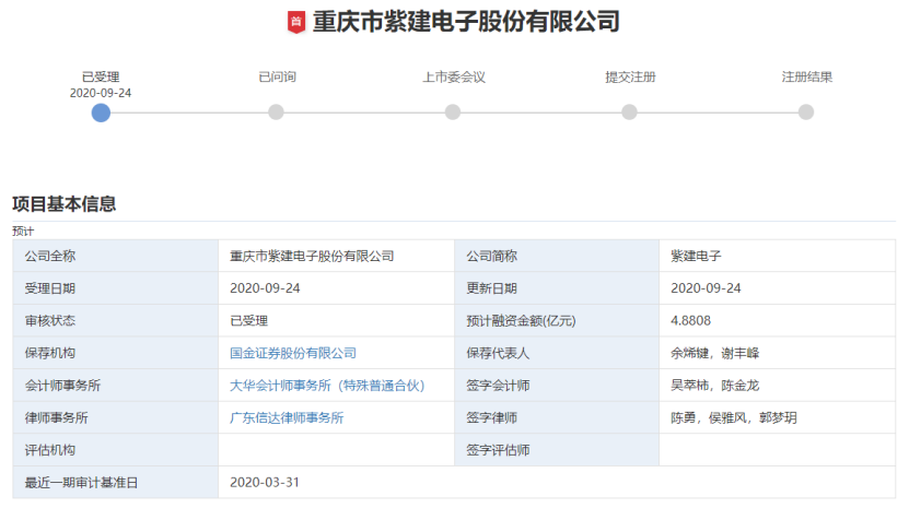2020年09月26日 | 华为\小米供应商紫建电子IPO受理,拟募资4.88亿元