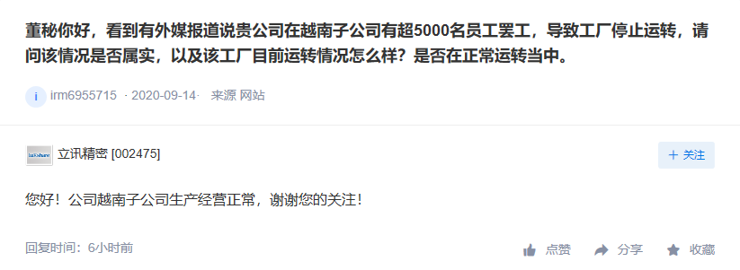 9月14日,有投资者提问:看到有外媒报道说贵公司在越南子公司有超5000名员工罢工,导致工厂停止运转,请问该情况是否属实,以及该工厂目前运转情况怎么样?是否在正常运转当中。立讯精密9月27日在互动平台表示:公司越南子公司生产经营正常。
