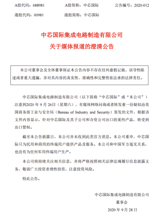2020年09月28日 | 中芯国际发布澄清公告:没收到美国商务部出口管制消息