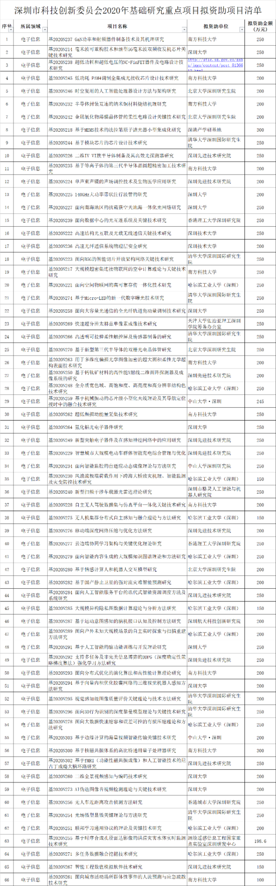 近日,深圳市科技创新委对外公示了2020年基础研究重点项目拟资助项目,302个项目榜上有名,涉及电子信息、生物和生态环保、智能装备、材料能源领域,拟资助总金额超过6亿元。